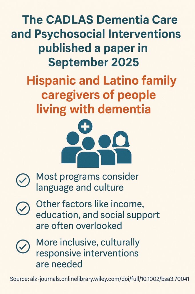 The CADLAS Dementia Care and Psychosocial Interventions published a paper in September 2025 as a collaborative effort to review how programs in the United States support Hispanic and Latino family caregivers of people living with dementia, focusing on whether these interventions truly address cultural, social, and economic realities. By examining 41 studies covering 25 caregiver programs, the authors found that most interventions consider language and culture but often overlook other important factors such as income, education, literacy, disability, religion, and social support, which can strongly affect whether programs are accessible, effective, and sustainable. The paper highlights major opportunities to improve dementia care by designing more inclusive, culturally responsive programs that better reflect the real‑life experiences of Hispanic and Latino caregivers and promote health equity (https://alz-journals.onlinelibrary.wiley.com/doi/full/10.1002/bsa3.70041).